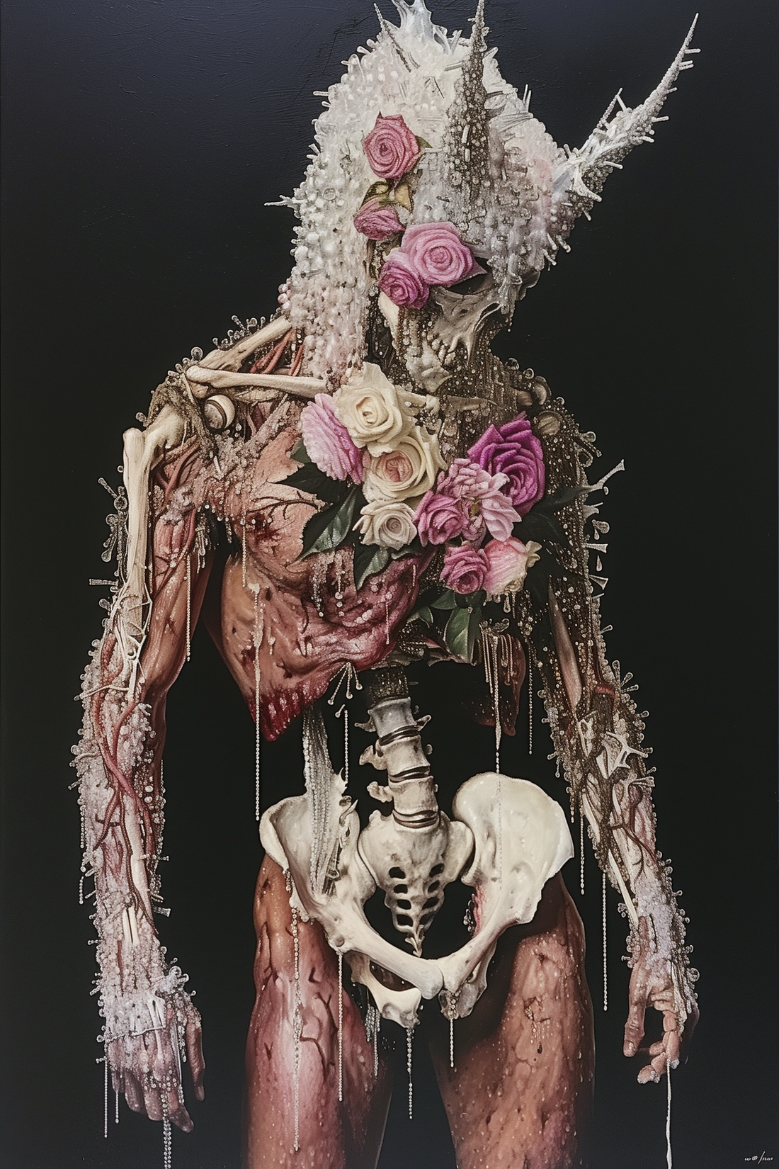 A delicate ribcage adorned with pink roses and glistening crystals, embodying the vulnerability and beauty...