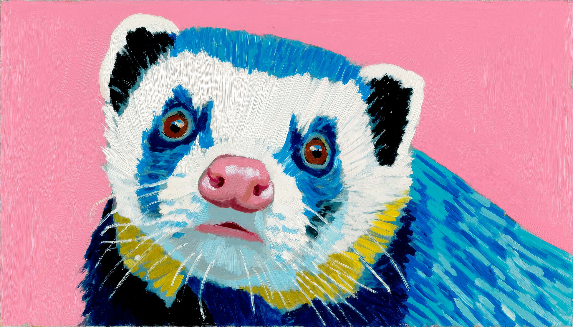 Staring straight at you, a ferret‑like creature sports streaks of electric blue and white against a flat bubblegum background. Its pink nose and orange‑ringed eyes lend it the candour of a stuffed toy, while a stripe of yellow fur pops like a scarf. This bold palette elevates a humble animal into a pop‑art icon where innocence meets surrealism.
