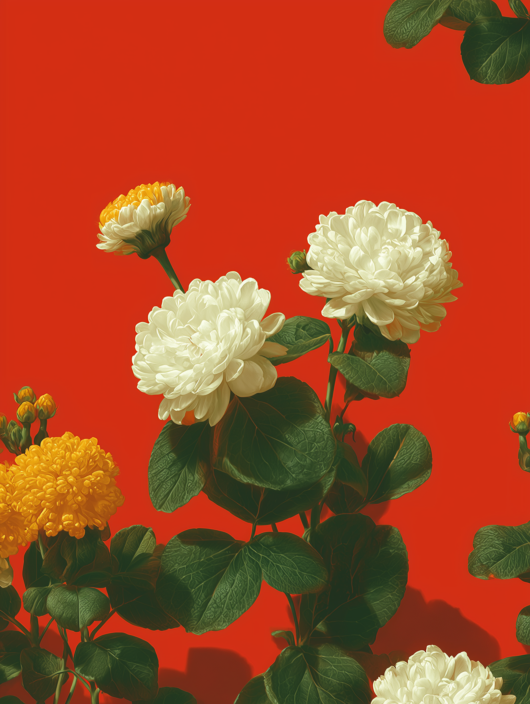 Sculptural ivory chrysanthemums rise gracefully from a deep green stem against a vivid crimson backdrop, their petals layered like polished porcelain. A golden marigold cluster anchors the base, adding warmth to the composition. The contrast of pure blooms and rich red evokes a sense of classical reverie, balancing purity and passion.Sculptural ivory chrysanthemums rise gracefully from a deep green stem against a vivid crimson backdrop, their petals layered like polished porcelain. A golden marigold cluster anchors the base, adding warmth to the composition. The contrast of pure blooms and rich red evokes a sense of classical reverie, balancing purity and passion.