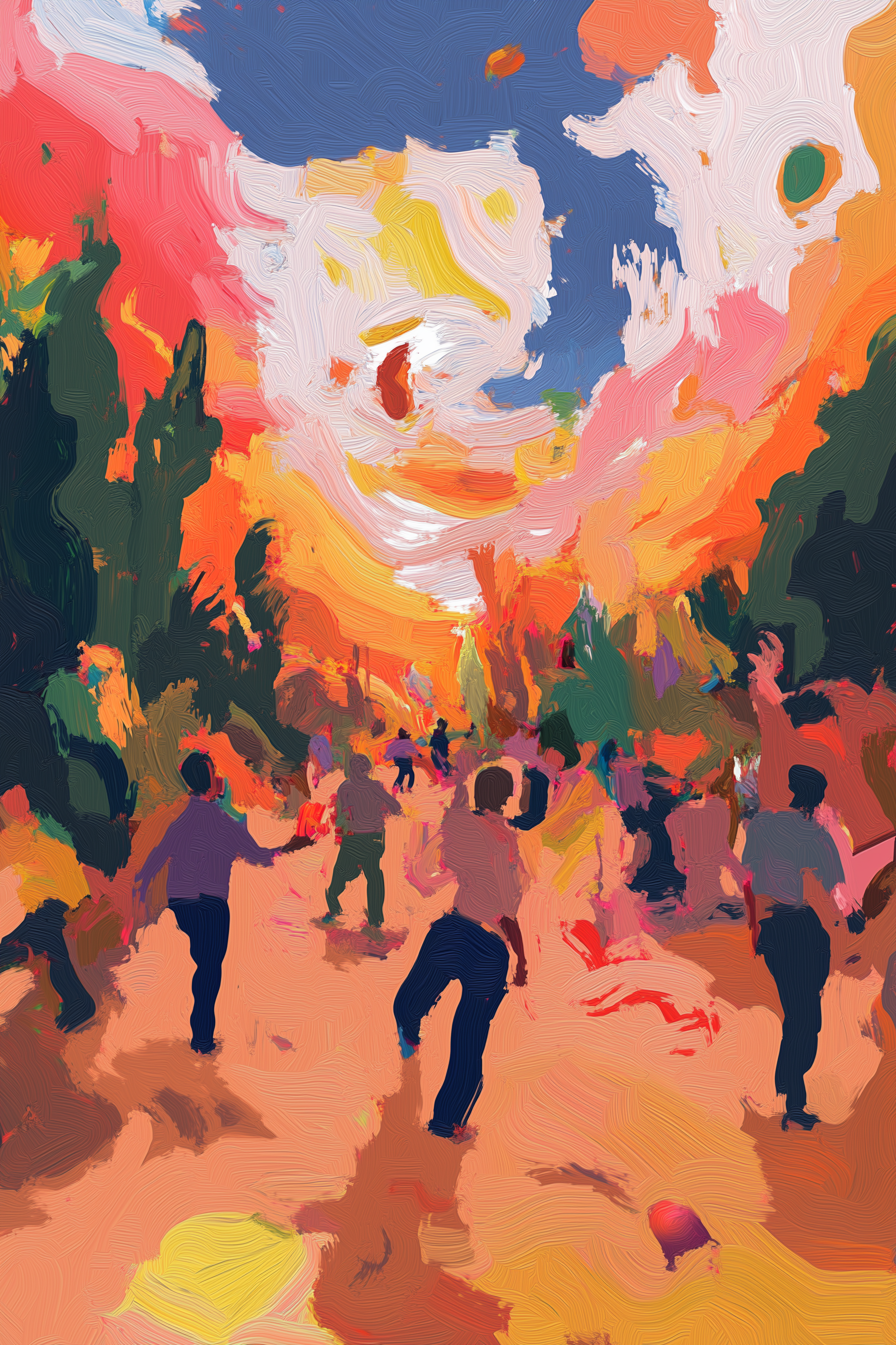 Eclipse of the Id" captures a profound moment of communal catharsis, where figures blend into a maelstrom of fiery hues and turbulent gestures. This painting reflects the chaotic beauty of human emotions unleashed during collective experiences, such as festivals or protests, where individual identities dissolve into a shared energy. The bold, swirling strokes and the vibrant contrast of colors evoke a sense of movement and transformation, suggesting a fleeting alignment where personal desires and societal currents intersect, mimicking an eclipse. This artwork invites the viewer to consider the ephemeral yet powerful nature of collective human spirit, challenging the boundaries between self and other.