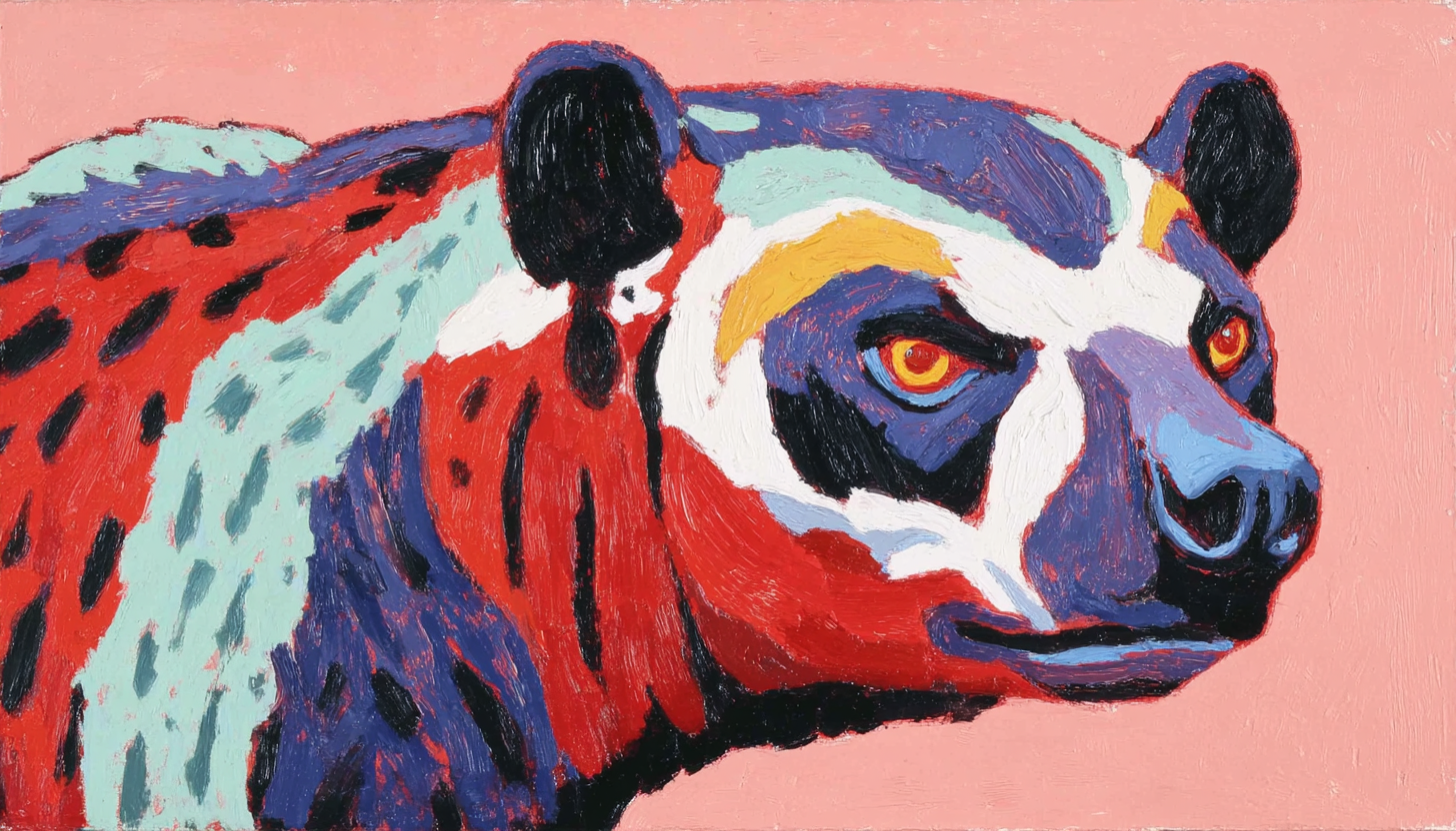 A honey badger flashes in mint green, crimson, violet and butter yellow, its fur morphing into unexpected spots and stripes. Piercing orange eyes and a sharp snout pop against a salmon pink backdrop, giving the animal the attitude of a punk icon. Energetic brushwork makes it both fierce and fabulous, challenging our ideas of menace and beauty.