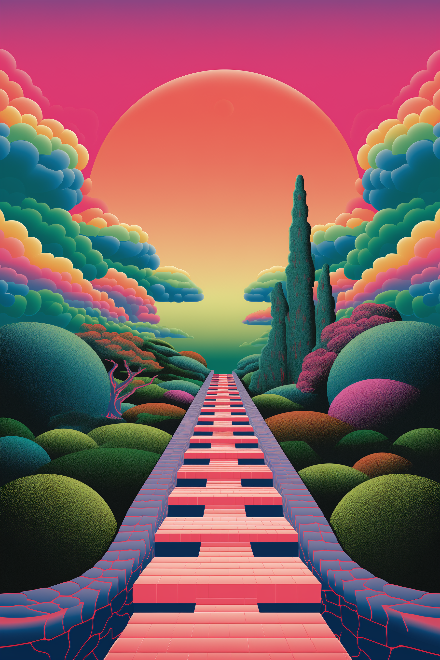 In a composition that merges minimalist architecture with celestial influences, 'Elevation Ethereal' elevates the spirit with its pastel skies and the gentle orb of light that crowns the staircase. It is a metaphorical climb towards enlightenment, each step bathed in soft, hopeful hues of dawn.