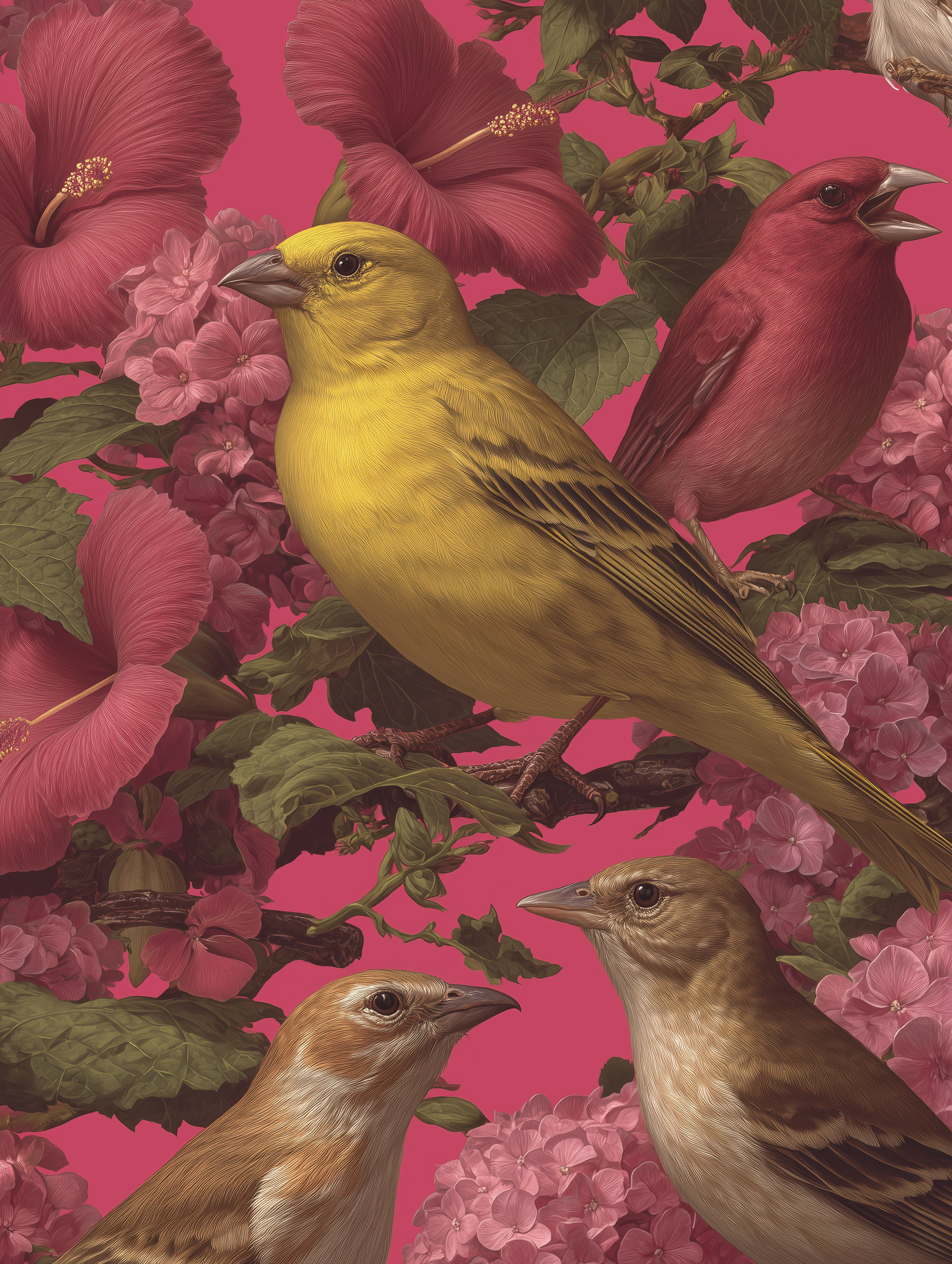 A luminous yellow canary commands the centre of this composition, its sunlit feathers contrasting against a riot of magenta blooms. Two companions—a crimson songbird mid-aria and a tawny sparrow—add harmony to the scene. Layers of petals and leaves spill across a hot pink background, turning the gathering into a vibrant, musical rhapsody of colour and song.
