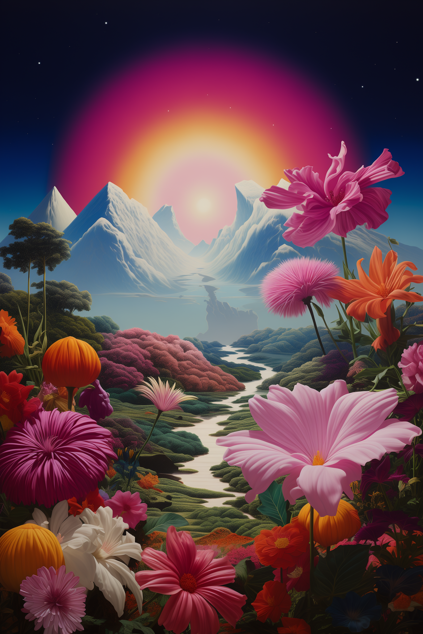Beneath an immense solar radiance that transitions from a vivid sunrise to the serenity of a moonlit night, this artwork captures the cyclical bloom of life. The radiant hues of the floral foreground contrast with the calming blues of the distant mountains, creating a striking balance between warmth and coolness, day and night, life’s vibrant presence and its peaceful slumber.