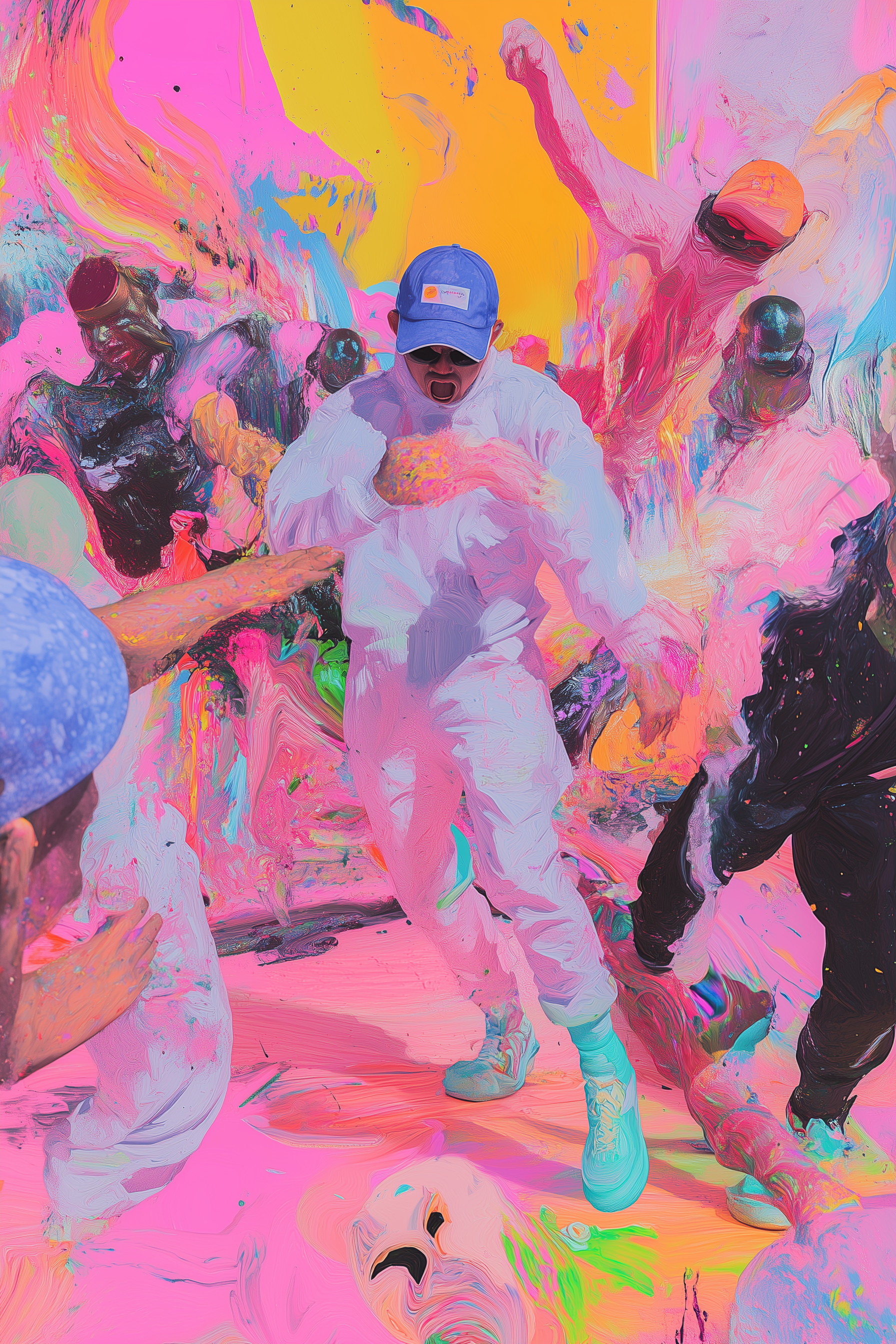 Resonance" plunges into the pulsating heart of a surreal celebration, where the ecstasy of dreams blurs the lines between reality and imagination. Here, the figures are enmeshed in a dance that transcends the ordinary, each movement amplified by vibrant swaths of color that seem to scream with energy. This artwork captures the intense vibrancy of human emotion, portraying a moment frozen in a psychedelic explosion of feelings, colors, and sounds. It reflects the artist's exploration of the chaotic beauty of human connection and the unspoken rhythms that move us. The image serves as a visual symphony that invites the viewer to feel the beat of the unseen drum and the electric pulse of shared human experiences. This piece isn't just viewed; it's felt, echoing the primal need to express and connect in the most visually stunning and emotionally resonant ways.
