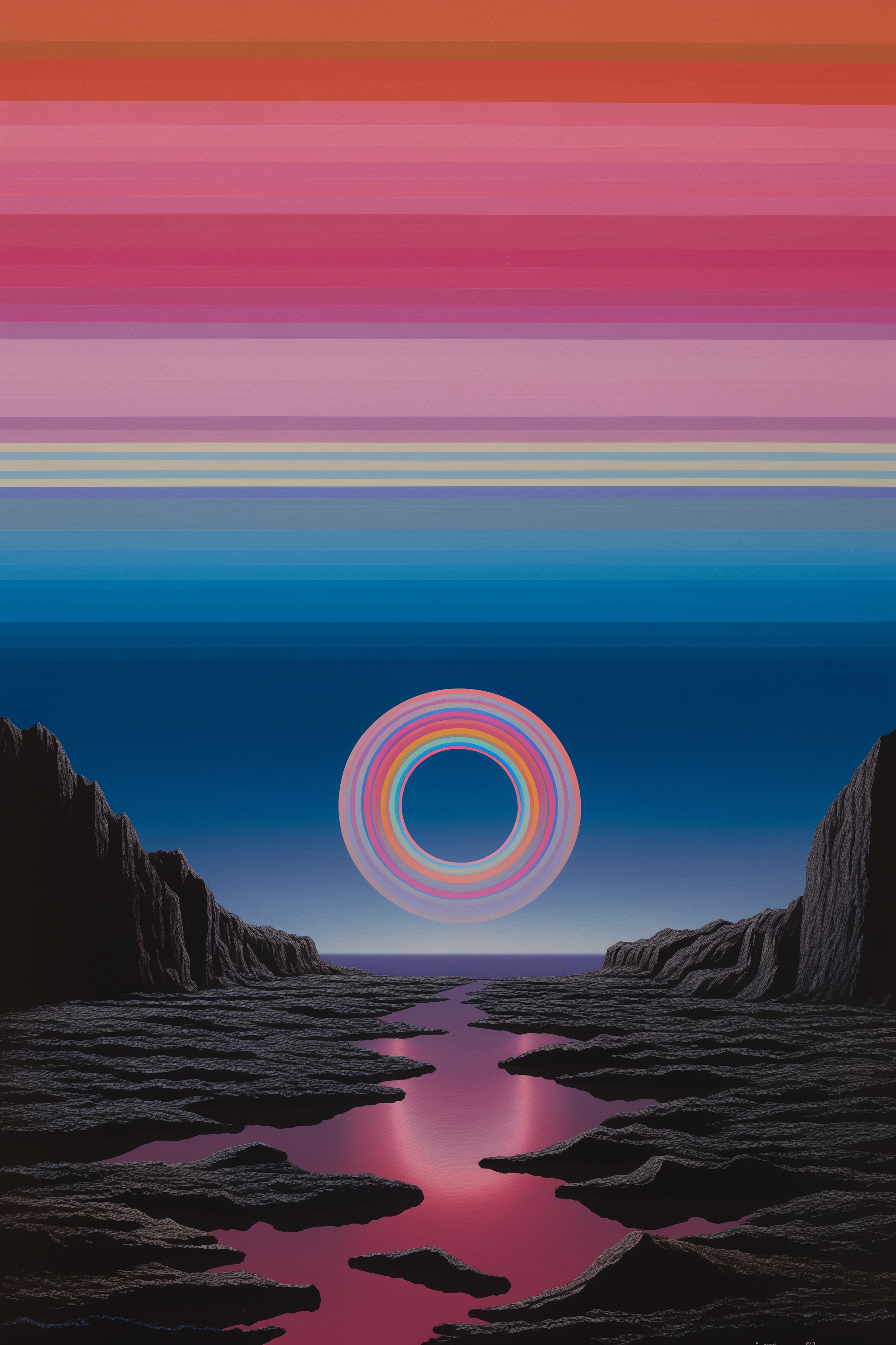 Capturing the stark beauty of an alien shoreline, this piece contrasts the everlasting calm of dark waters against the vibrant life of the skies, crowned by an enigmatic ring that symbolizes the infinite cycles of nature and existence.